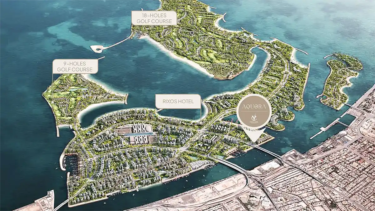Set against the backdrop of Dubai Islands, formerly known as Deira Islands, Aquora sits within a visionary master plan aligned with Dubai’s 2040 Urban Master Plan. Spanning 60 kilometers of coastline and 20 kilometers of serene beaches, the destination includes five luxury resort islands, lush green spaces, and a prestigious golf course, making it a premier choice for those seeking a balanced, luxurious lifestyle.