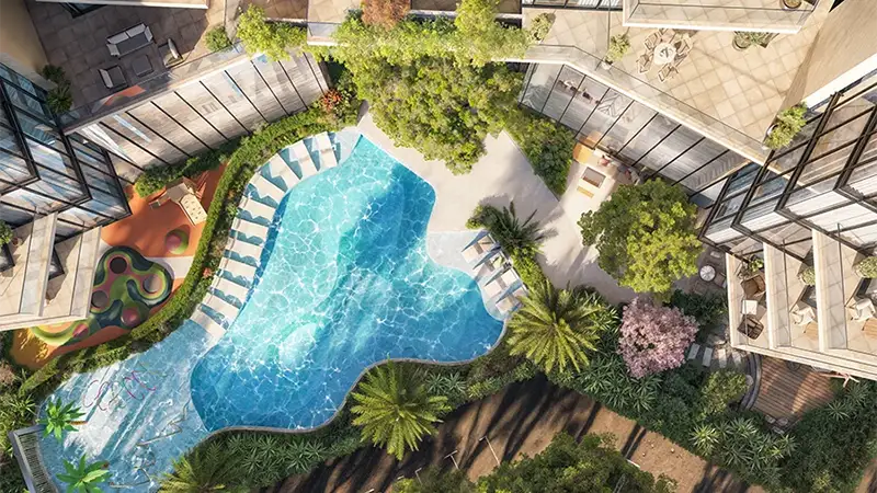 Infinity pool, family pool, gym, meditation areas, sauna, kids’ play zone, library, and rooftop garden.