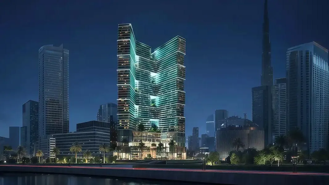 - Iconic high-rise design with glossy glass layers, recessed terraces, and flowing structural lines.