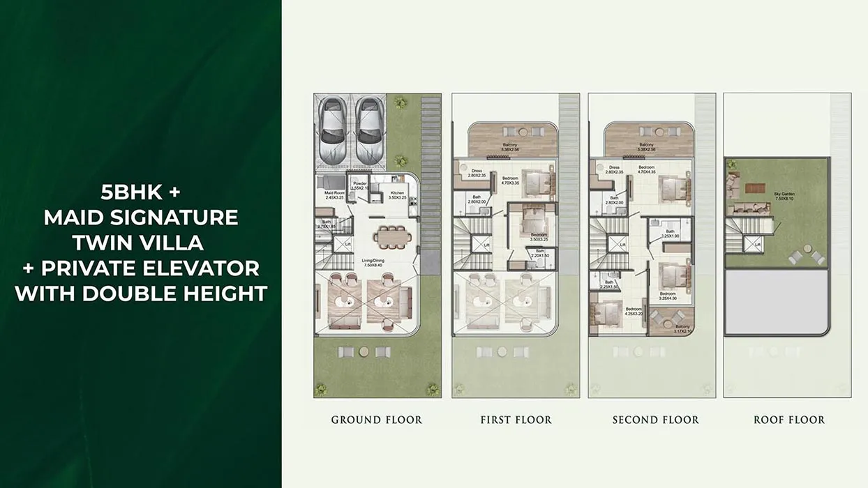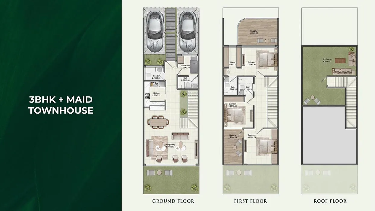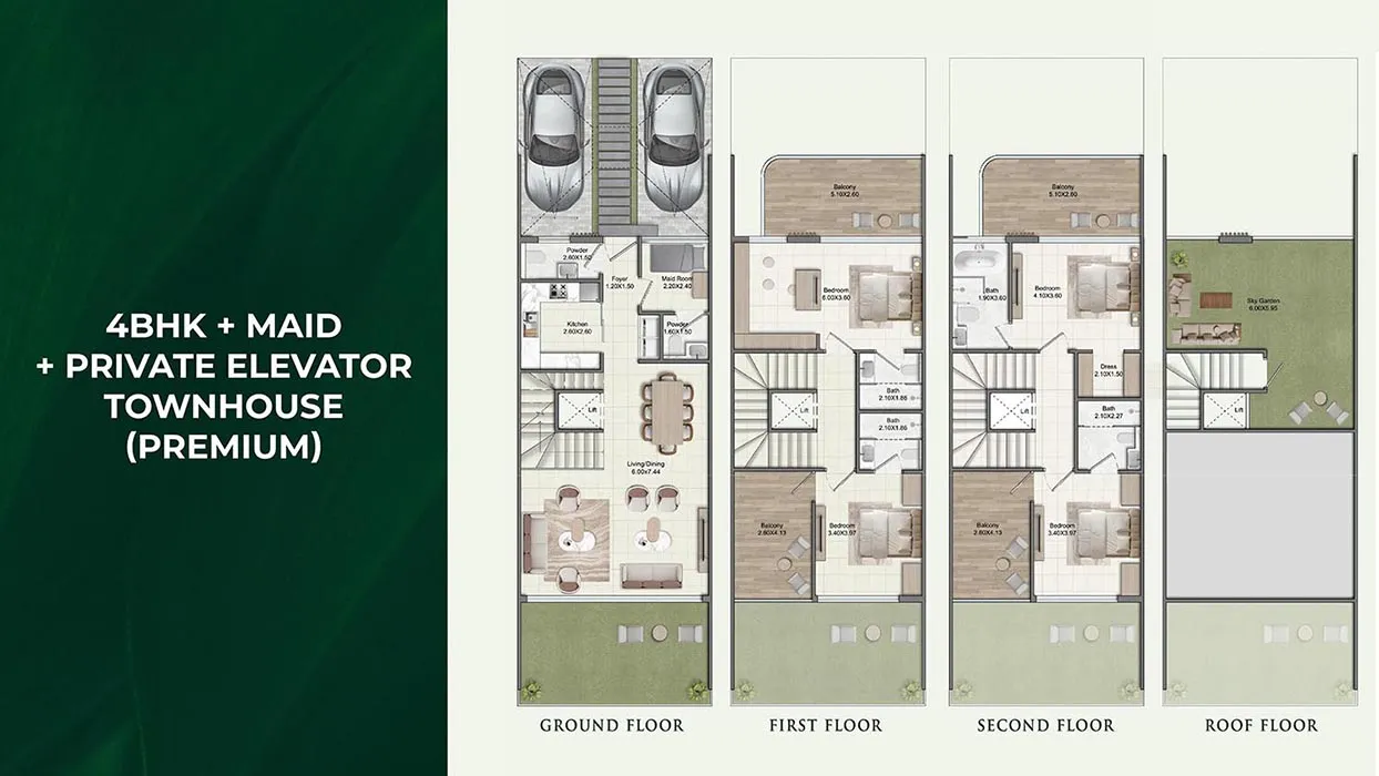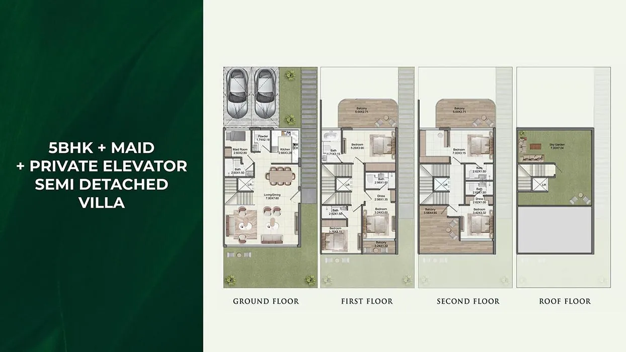 The floor plan of Greenz by Danube in Phase 1 focuses on well-planned layouts featuring 3, 4, and 5-bedroom townhouses along with semi-detached villas, designed to offer spacious interiors and functional living zones. Each unit layout emphasizes open-plan living and dining areas, modern kitchens, ensuite bedrooms, private outdoor spaces, and dedicated parking, ensuring a balance between comfort and practicality. The Phase 1 units are crafted to deliver flexible living arrangements with optimized bedroom configurations, allowing residents to enjoy privacy while maintaining seamless indoor-outdoor connectivity within this green-focused villa community.
