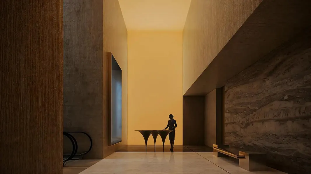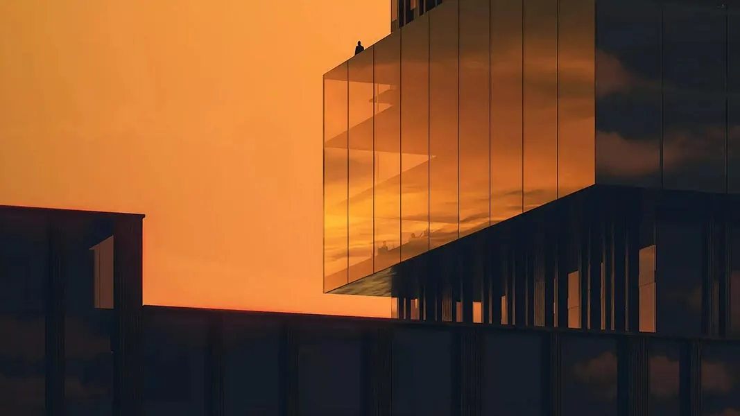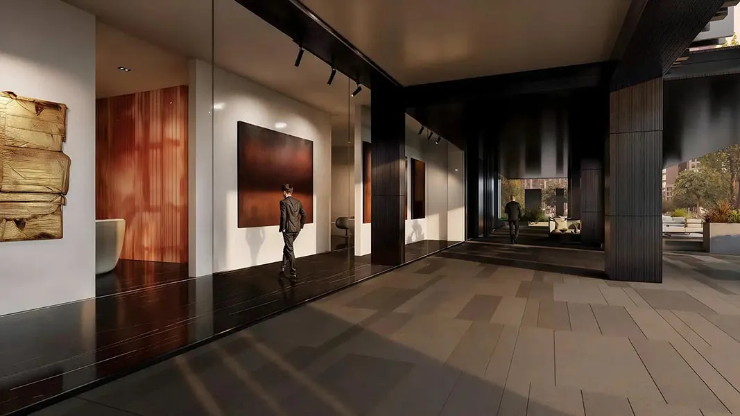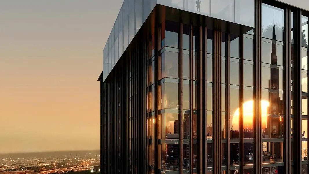 The building features a sleek, contemporary design with stepped volumes and large stained-glass windows. Panoramic glazing ensures natural light fills every workspace, offering stunning views of the canal, nearby parks, and the Business Bay skyline. The entrance lobby exudes sophistication with curated art installations, elegant lighting, a welcoming seating area, and convenient access for vehicles.