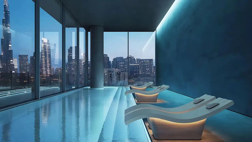 Amenities at Inaura transform daily living into a resort-like experience. Residents can enjoy indoor and outdoor pools, a state-of-the-art fitness center, a private cinema, and tranquil spaces like the library and business lounge. The dedicated spa and wellness center—complete with steam rooms, saunas, and serene relaxation areas—adds a refreshing layer of wellbeing. Each element is designed to offer a calm escape from the fast-paced city just beyond the tower.