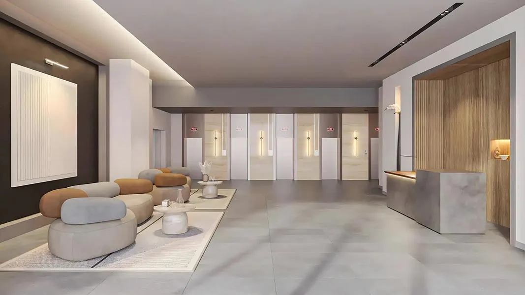 - Grand entrance lobby with double-height ceilings, reception, and guest waiting area