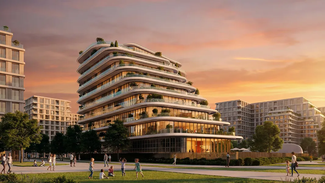 The mid-rise structure, configured as 2 basements, ground level, and eight residential floors, is defined by soft geometry and stepped façades. Large balconies and terraces are carefully integrated to invite natural light and airflow, shaping an architectural presence that feels open, balanced, and visually calm.