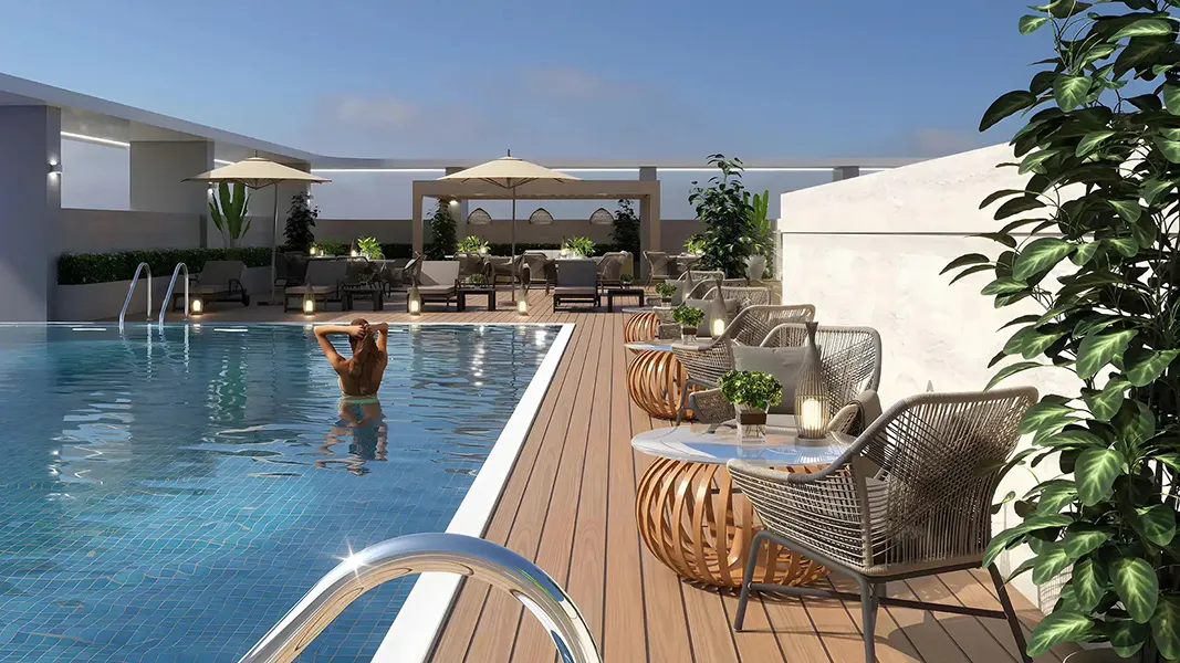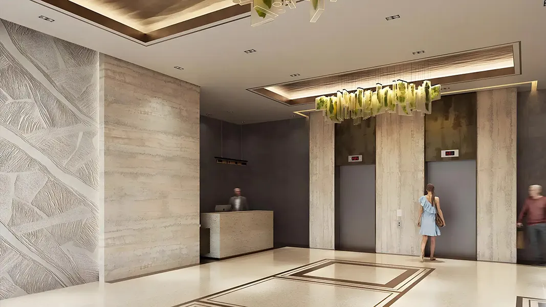 Infinity pool, spacious lobby, relaxation areas, smart systems, and eco-friendly features.