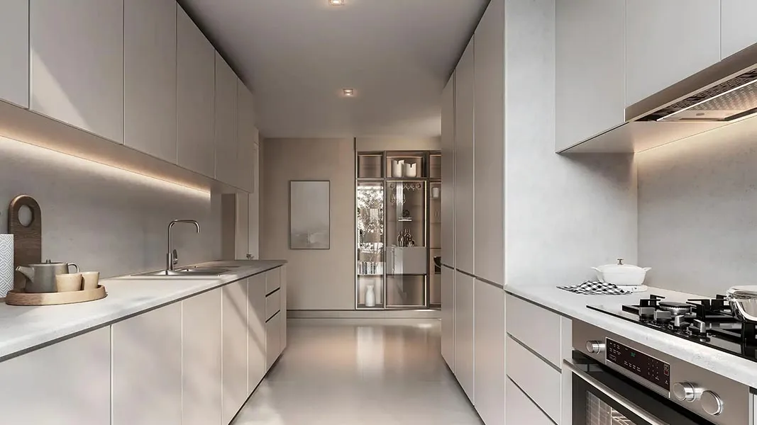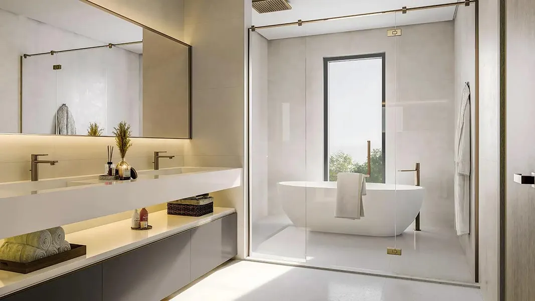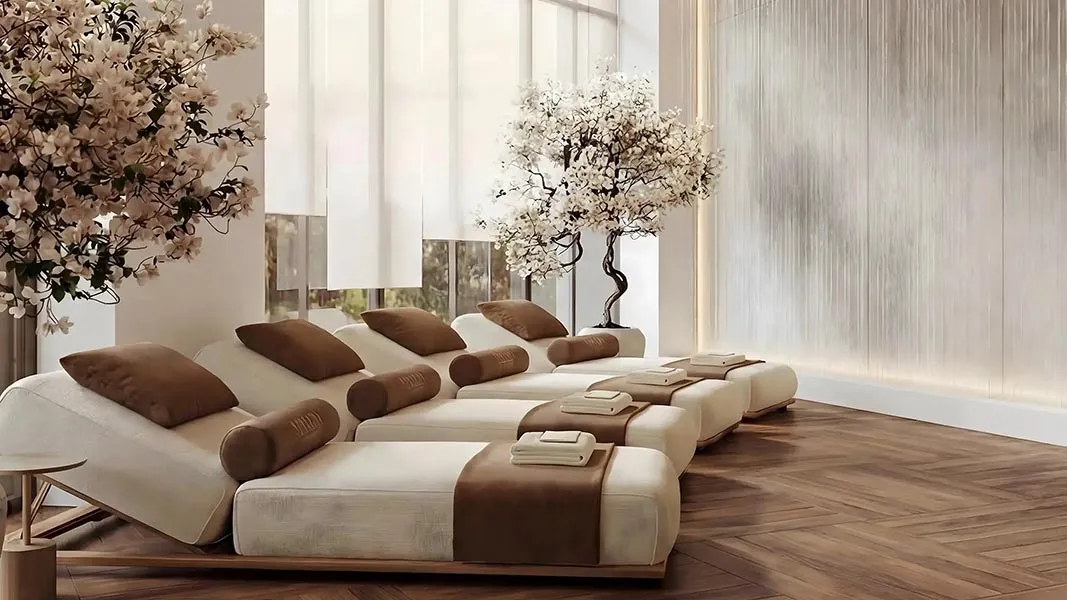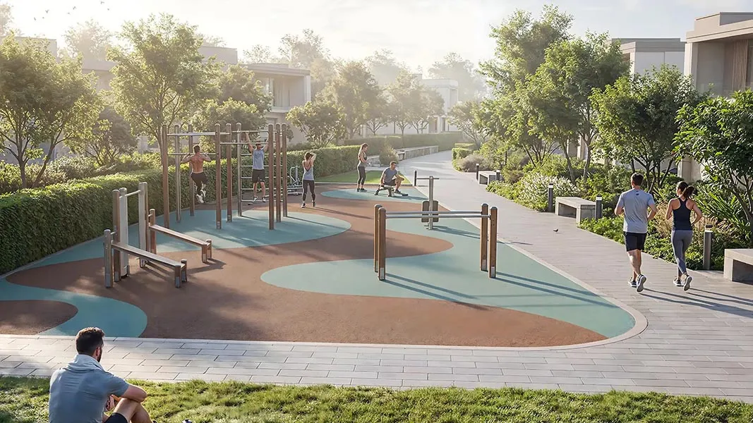 Private pools and gardens, beach lagoon, lazy river, parks, cycling tracks, wellness zones, co-working spaces, and residents’ lounges.