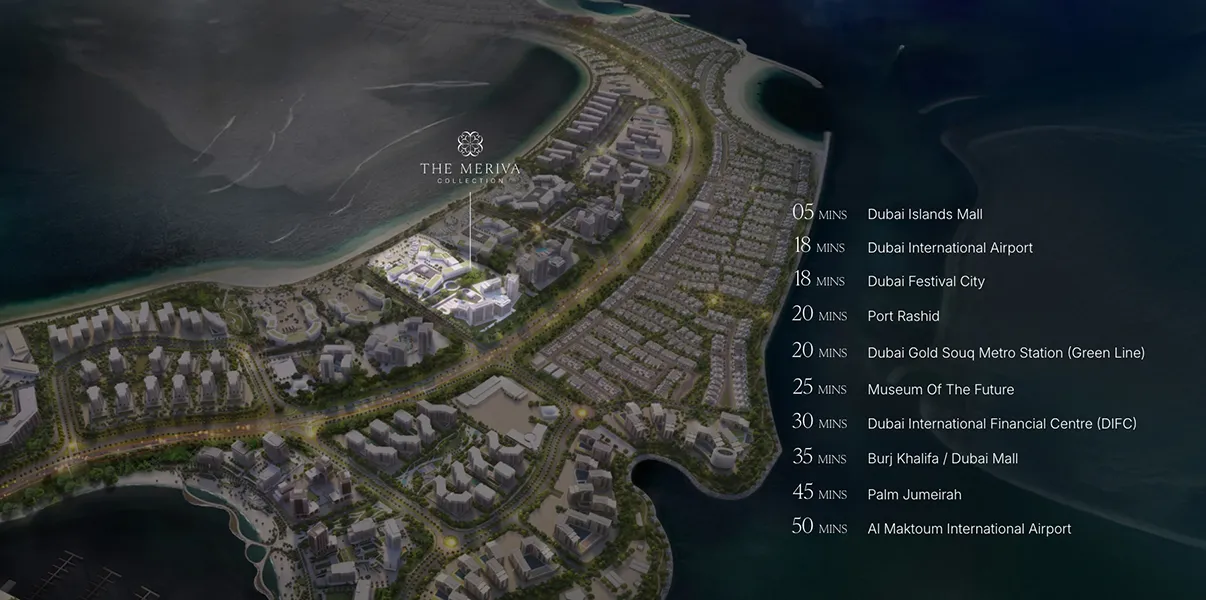The Meriva Collection benefits from strong connectivity to major transport routes across Dubai while retaining the calm of island living. Surrounded by planned hospitality, retail, and leisure developments, the project appeals to both end-users and long-term investors seeking waterfront value.