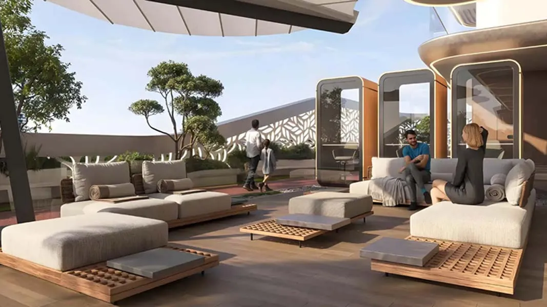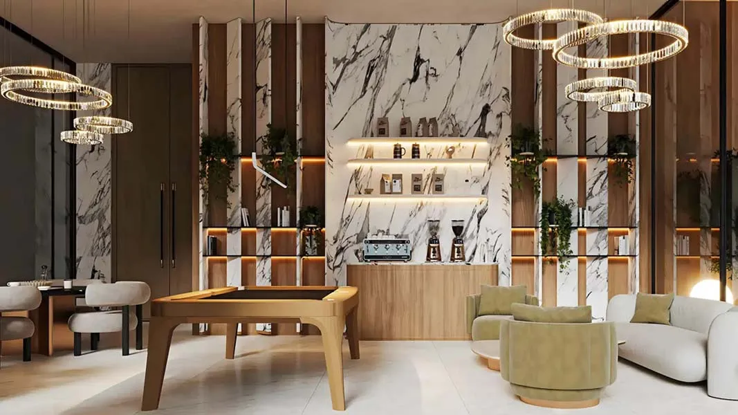 Above it all, the rooftop becomes a social and leisure destination, where an infinity-edge pool meets panoramic views of the surrounding waterfront. Bar lounge settings, BBQ areas, outdoor dining spaces, and landscaped zones come together to create moments of connection, relaxation, and celebration against the backdrop of the sea.