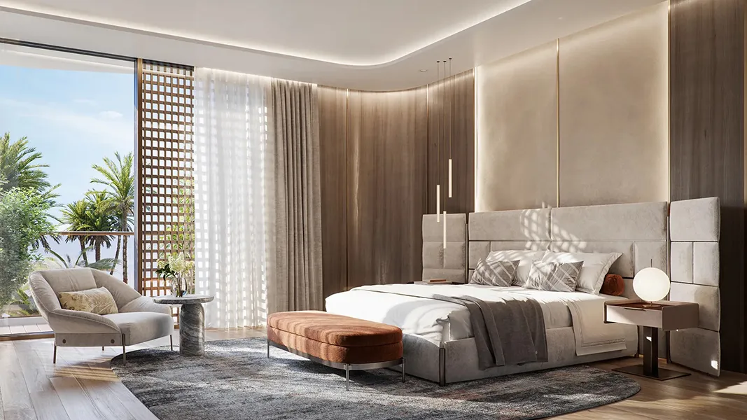 - Bedroom with premium textiles, natural elements, and fully furnished, bright, airy interiors